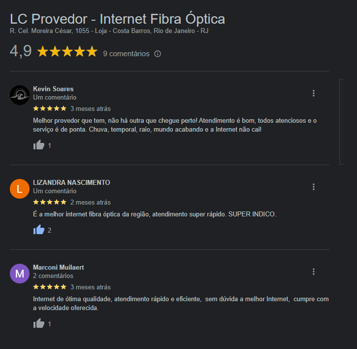 Navegue em alta velocidade Adquire já! A melhor Internet Fibra Óptica da região! Interner Fibra Óptica Wi-fi Grátis Suporte Especializado Velocidade Simétrica CONHEÇA NOSSOS PLANOS: FEEDBACK DE CLIENTES: CONTATO: WhatsApp: (21) 98006-7083FACEBOOK/LCPROVEDOR INSTAGRAM/LCPROVEDORTEL: (21) 3195-3053